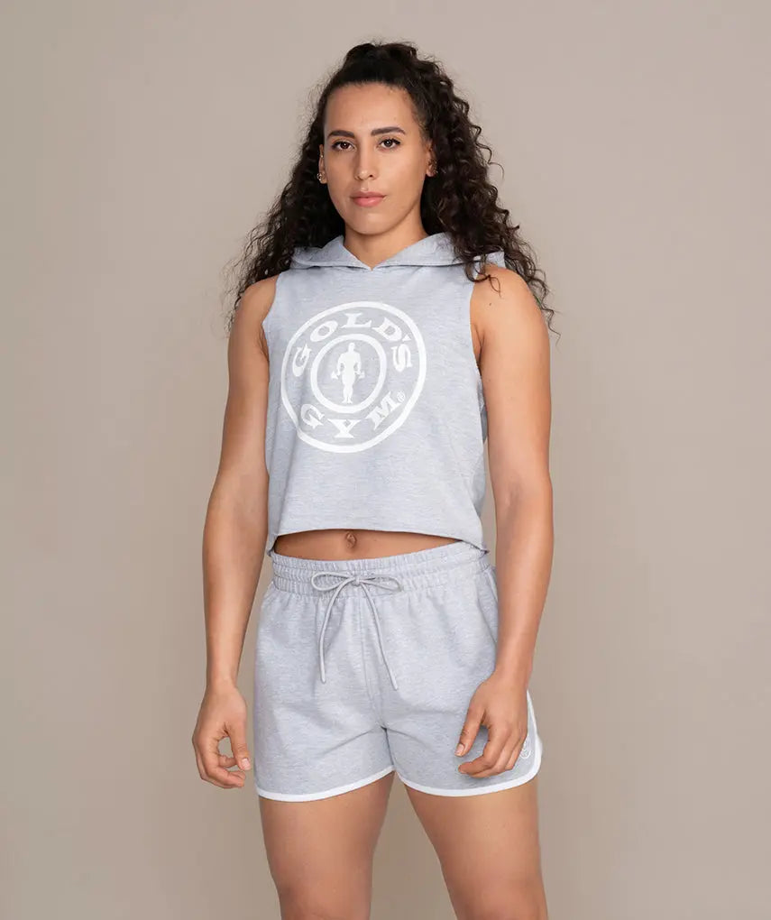Känn dig som en självklar del av Gold’s-communityt i denna ärmlösa hoodie för kvinnor – ett statement för dig som tar din träning på allvar. Med en cropped, luftig passform i lätt "French terry"-bomull och återvunnen polyester håller du dig sval och rörlig under hela passet. Hoodien är öppen i fållen, har en tvådelad huva och är försedd med Gold’s Gym-logga både fram och bak. Den matchar perfekt med både joggers och träningsshorts och är lika snygg i gymmet som till vardags.