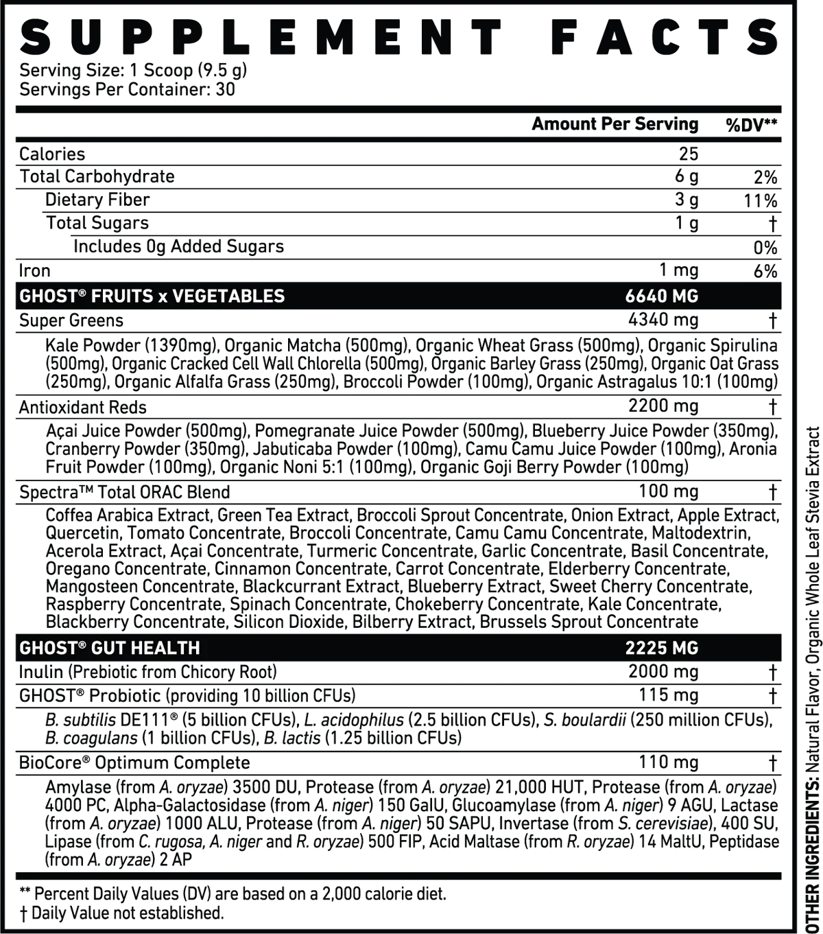 Ghost Greens är ett växtbaserat kosttillskott med 19 noggrant utvalda greens och reds, utformat för dagligt intag i samband med en aktiv livsstil. Formulan innehåller en blandning av växtextrakt, frukter och grönsaker tillsammans med Spectra™ Antioxidant Blend, prebiotika, 10 miljarder CFU probiotika (DE111) och BioCore® Optimum Complete – ett enzymkomplex som hjälper kroppen att bryta ned kolhydrater, proteiner och fetter.