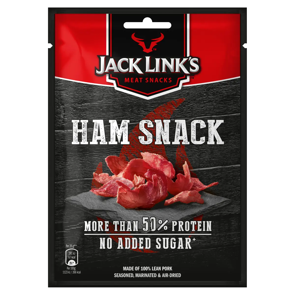 Jack Link’s Ham Snack är ett smakrikt och smart val för dig som vill fylla på med protein utan onödiga tillsatser. Varje 25 g-påse innehåller hela 13 g protein – det är över 50 %! Snacksen är tillverkade av 100 % magert fläskkött, lufttorkade för perfekt tuggmotstånd och smak, helt utan tillsatt socker. Med endast 67 kcal per påse är de ett utmärkt val både efter träning och som ett snabbt mellanmål. Jack Link’s använder 240 g högkvalitativt fläskkött för att tillverka 100 g snacks – det märks i smaken och kvalitén.