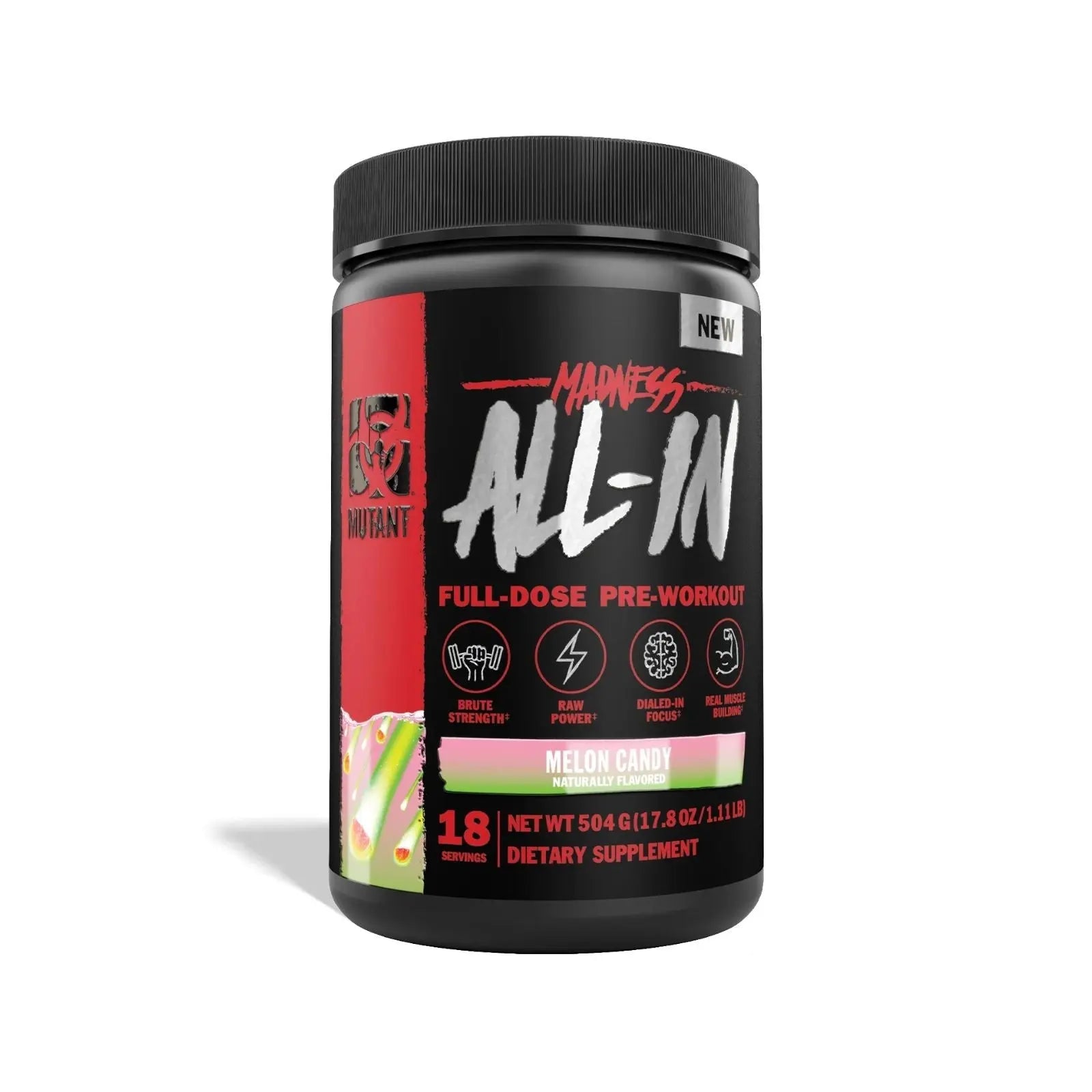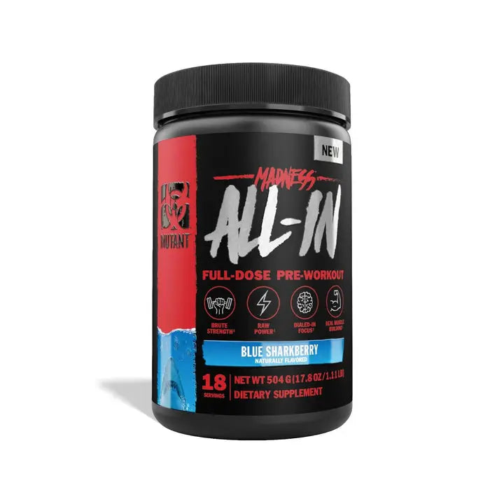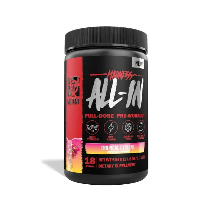 Mutant Madness All-In är en avancerad all-in-one pre-workout för dig som vill ha maximal effekt av varje träningspass. Med kliniskt beprövade ingredienser som kreatinmonohydrat, betain, citrullinmalat och tyrosin får du en explosiv blandning av styrka, fokus, pump och uthållighet – utan att behöva kombinera flera produkter. Varje dos är vetenskapligt balanserad för att öka proteinsyntes, syreupptagning och mental skärpa. Oavsett om du är ny på gymmet eller tränat i åratal ger Madness All-In dig förutsättningarna att prestera bättre, bygga mer och återhämta dig snabbare.