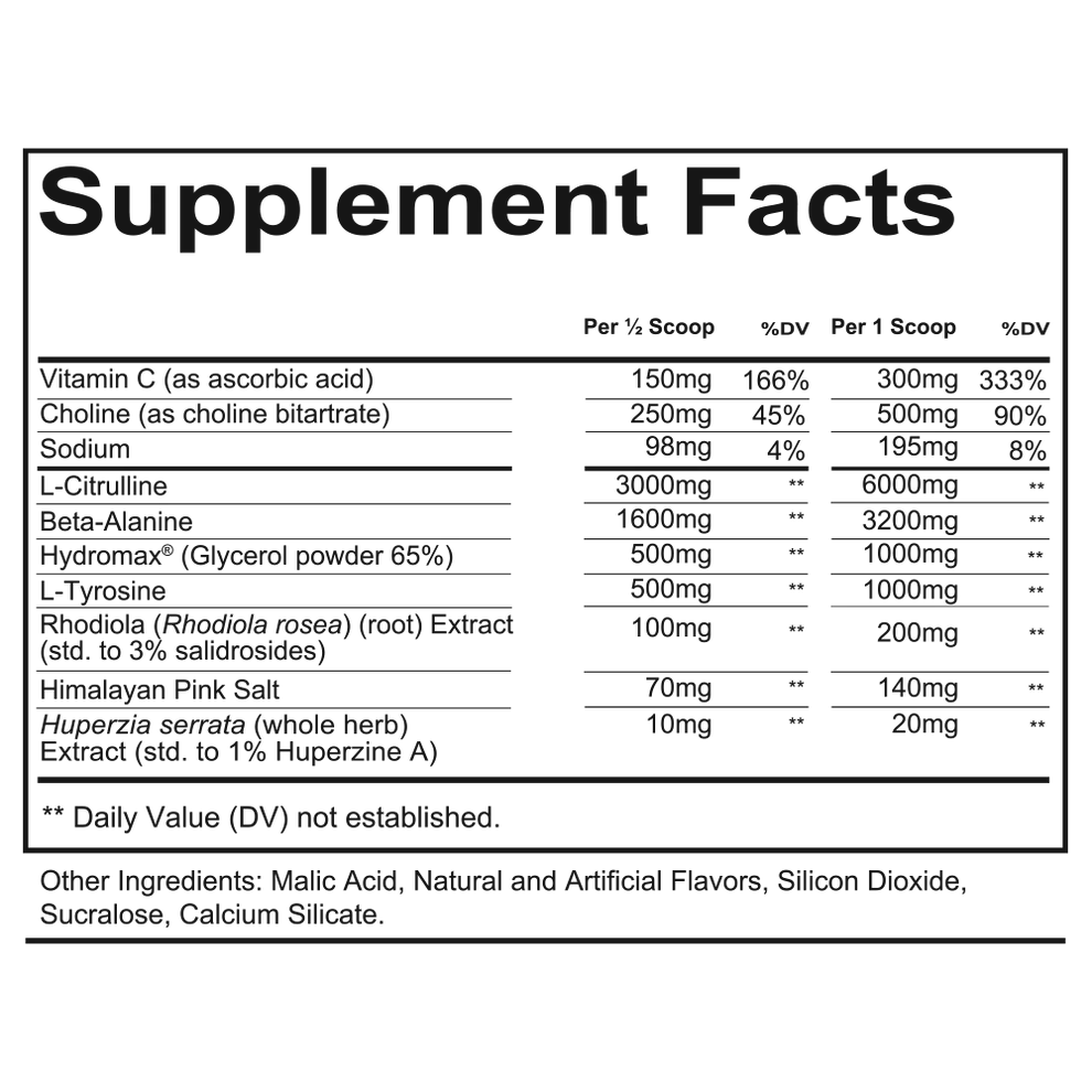 • 6 g L-citrullin, 3,2 g beta-alanin och 1 g Hydromax per portion