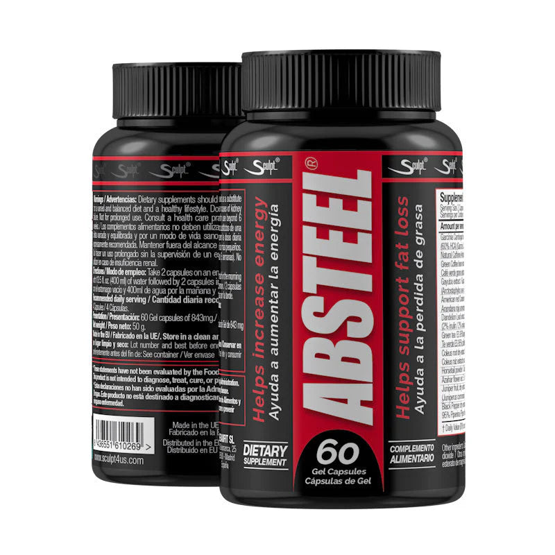 Absteel® från Sculpt® är en avancerad fettförbrännare särskilt framtagen för män som vill minska kroppsfett, öka energin och behålla muskelmassa. Med en noggrant utformad blandning av L-Carnitine Tartrate, Glucomannan, Garcinia Cambogia och koffein hjälper den kroppen att omvandla fett till energi, dämpa hunger och stödja hormonbalans. Produkten främjar även ketonproduktion, vilket bidrar till att bevara muskelmassa vid kaloriunderskott. Absteel® passar perfekt för dig som vill komplettera en aktiv livsstil med ett effektivt och funktionellt kosttillskott för fettförbränning och prestationsförmåga.
