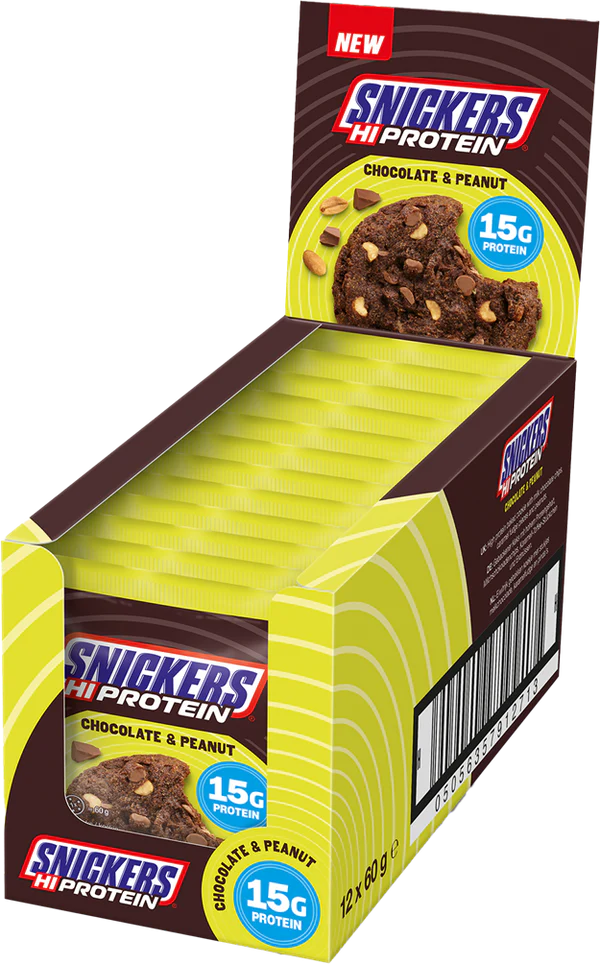 Snickers HiProtein Cookie är ett proteinrikt och krispigt mellanmål med den autentiska Snickers-smaken. Varje kaka innehåller 15 g protein för att stödja muskeluppbyggnad och återhämtning, samtidigt som du får njuta av en läcker kombination av choklad, jordnötter och en mjuk, krispig konsistens. Perfekt att ha med i väskan för en snabb och god proteinboost när du behöver den!