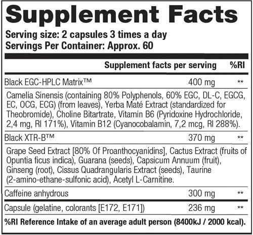 Stacker2 Black Burn är en högkoncentrerad fettförbrännare som kombinerar 300 mg koffein med väldokumenterade växtextrakt för att maximera både fettförbränning och energi. Formulan innehåller bland annat extrakt från kaktus, druvkärnor, yerba maté och andra ämnesomsättningsstimulerande ingredienser, tillsammans med vitamin B6 och B12 som bidrar till normal energigivande metabolism. Black Burn är framtagen för dig som vill ha ett kraftfullt verktyg i din viktminskningsresa, särskilt inför morgonträning eller intensiva pass på gymmet. Varje burk innehåller 30 doser – en hel månads effektivt stöd för din diet och ditt träningsmål.