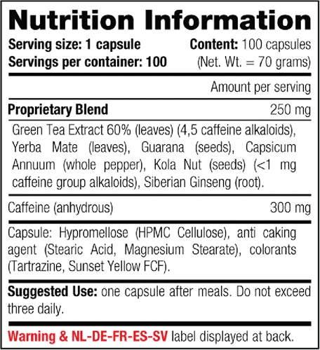 • 300 mg koffein per kapsel för kraftfull energi och fokus