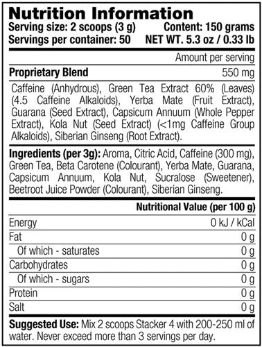 Stacker 4 är en fettförbrännare i smidig pulverform som ger dig en kraftfull kick inför cardio eller morgonträning. Med hela 300 mg koffein per portion, samt välkända ingredienser som kolanöt, yerba mate och sibirisk ginseng, ger den både energi och förbränningsstöd. Pulvret löser sig lätt i vatten, smakar gott och slipper omvägen via kapslar – vilket gör att kroppen snabbare tar upp de aktiva ämnena. Perfekt för dig som vill ha ett effektivt och välsmakande tillskott för att boosta förbränningen varje dag.