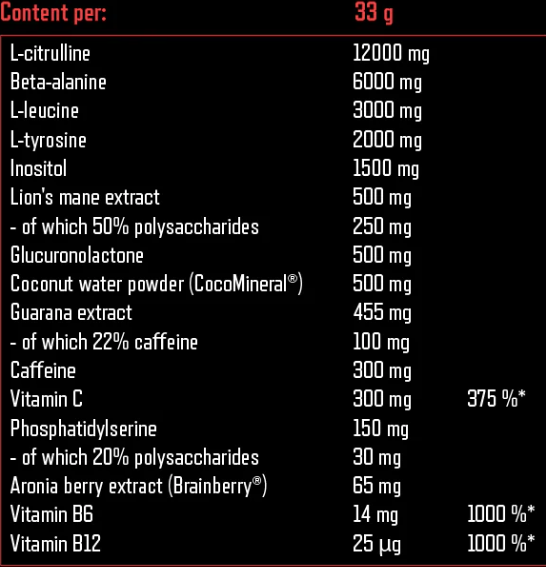 • 12 000 mg L-citrullin och 6 000 mg beta-alanin per portion